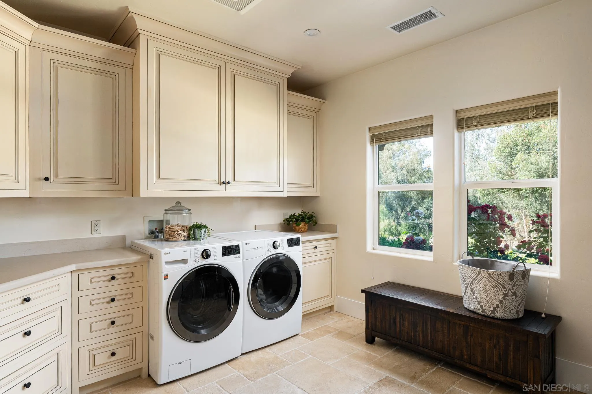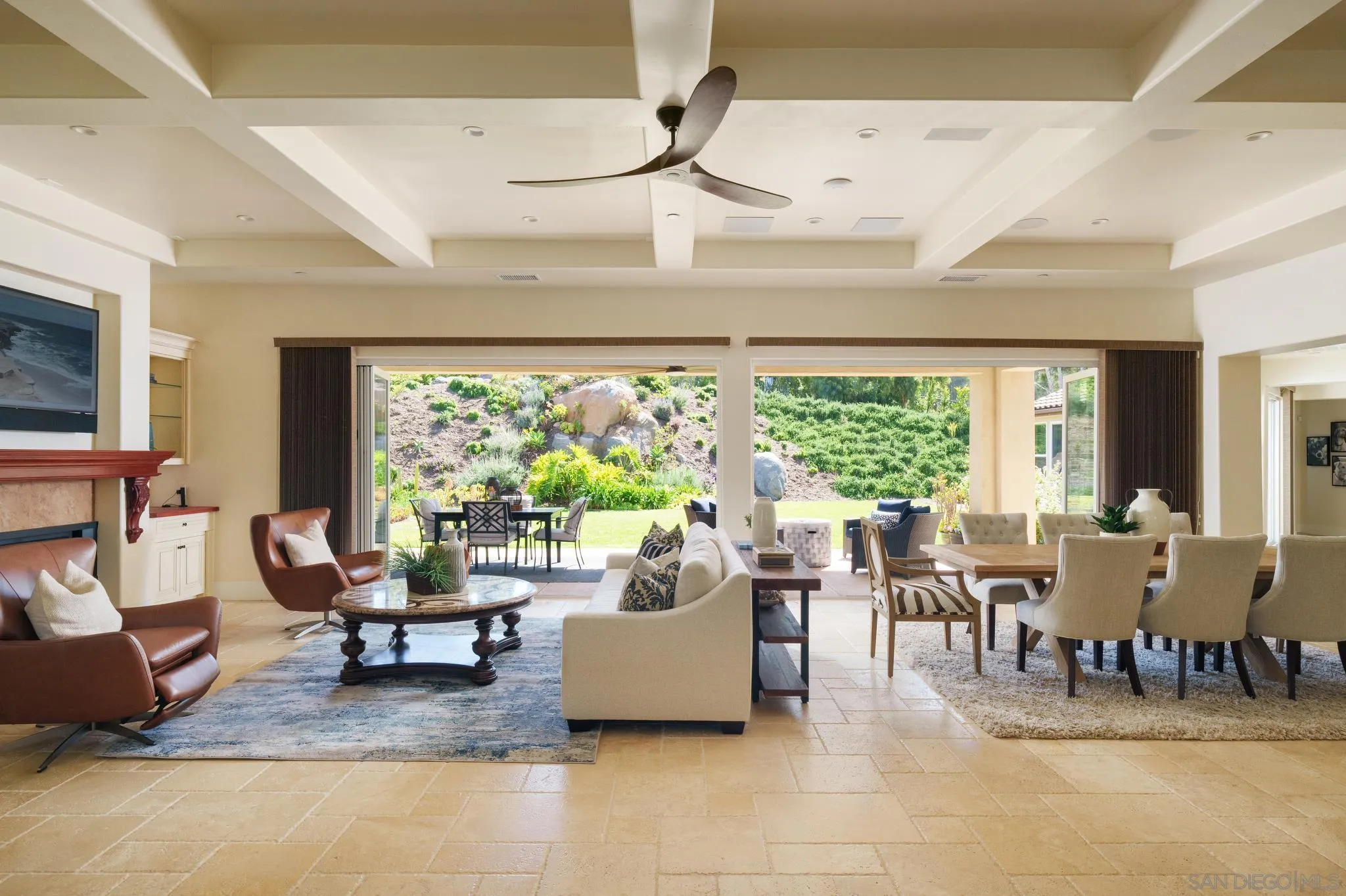 Your Dream Home Awaits! This stunning Tuscan-styled home was custom built in 2020 and exudes elegance & sophistication in the coveted Mt. Helix area. Upon entering through the beautiful arched wood doorway, you will be greeted by soaring 11 ft ceilings and chiseled travertine floors that lead into a breathtaking Great Room. Relax by the 60" fireplace while enjoying the surround speakers, recessed LED lighting & 24' of folding La Jolla patio doors that seamlessly open out to a 700 sq ft covered patio & a serene backyard oasis. The Chef's Kitchen is a culinary masterpiece that will delight your guests & make entertaining a breeze with its 6-seater island, suite of KitchenAid appliances and walk-in Butler's Pantry, accented by Tuscan-mosaic back splash and custom cabinetry. Occupying its own wing, the Primary Retreat features a 16x19 bedroom with private patio, a spa-like bath with custom tilework and jacuzzi tub, a 12x14 dressing room, a fitness room and separate office. On the opposite wing of the home, you will find 2 large guest rooms, each with ensuite baths, as well as a 12x12 laundry room! The 4-car garage comes with a Tesla charger and has room for all your toys, while a 240 sq ft shed can be used for storage, a studio, or a workshop. A state-of-the-art Control4 Smart Home system gives you control of the lights, TV's, speakers and security system at your fingertips, while dual tankless water heaters, water filtration system, 3 zone HVAC ensure maximum comfort and efficiency. Set upon 1.3 private, beautifully landscaped acres, this home truly is one of a kind